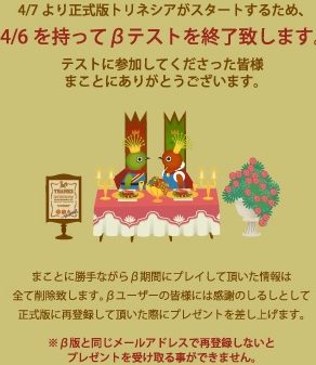 現在ベータ版でご利用いただいている登録メールアドレスと同じもので正式版にご登録いただきますと、家具や服のプレゼントがございます。現在の登録メールアドレスが無効になっている場合はプレゼントが受け取れませんので、もし無効になっている場合は4月6日までにメールアドレスの変更をお願い致します。